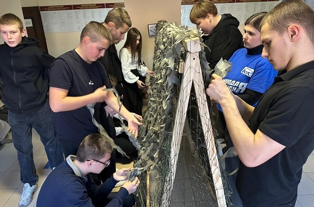 В день рождения «Единой России» активисты «Молодой Гвардии» и секретарь Тацинского местного отделения партии Людмила Цеценко организовали мастер-класс по плетению маскировочных сетей для учащихся Тацинской №2 и Ермаковской школ.