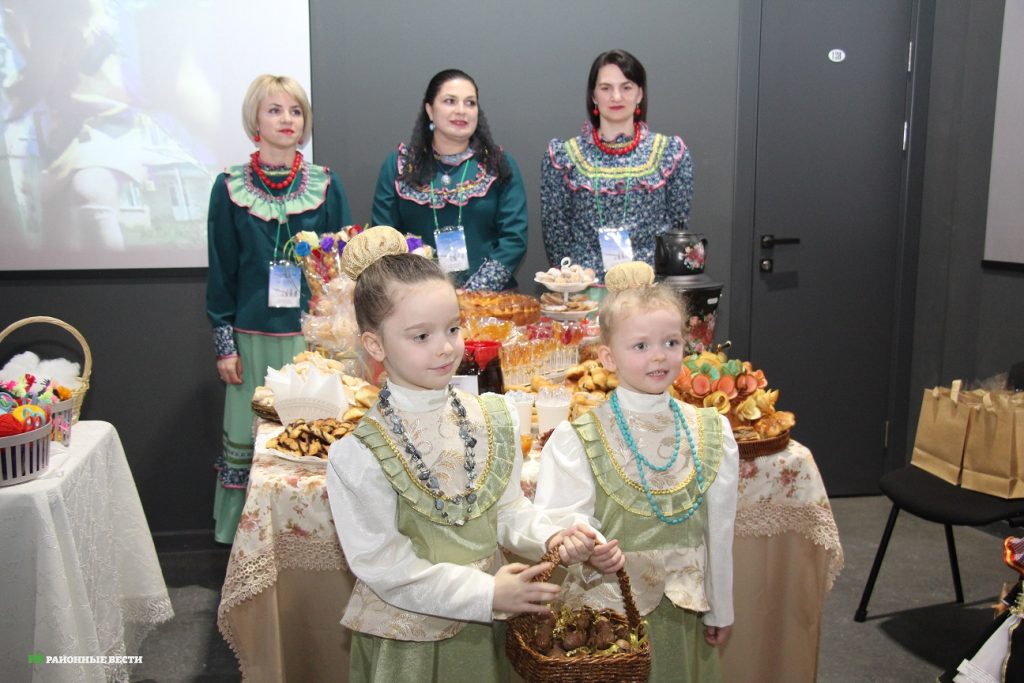 Детсады накрыли стол. Угощение — хворост, блины, вафли, пирожки со свеклой, картофель и печенка, леденцы на палочке, чай из трав, варенье, мёд.