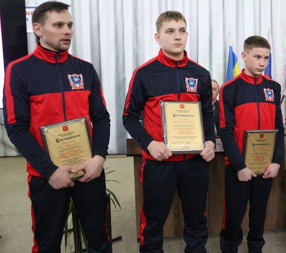 Воспитанники Жирновского спортклуба Никита Бабенко и Артём Дьяченко (справа налево) за высокие результаты в первенстве России по гиревому спорту в Перми в составе сборной Ростовской области отмечены Благодарностью главы администрации поселения Натальи Тришечкиной. Такой же награды за большой вклад в развитие гиревого спорта удостоен тренер Илья Петрухин (слева). Фото Д.Огневой