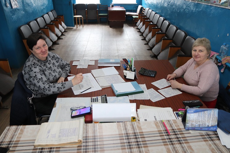 Пока техника готовится к выходу, в конторе кипит своя работа. Елена Соколенко, учётчик СПК, уже 14 лет меряет «саженем» объёмы работ каждого тракториста в полях. В хозяйстве Елена Львовна с 1993 года, раньше, когда было животноводство, была заведующей фермой. Сейчас разносит путёвки, оформляет наряды за вчерашний день и готовит задания на сегодня.