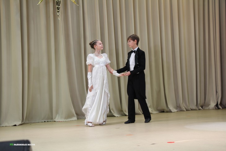 Ведущая и автор сценария Елена Ефимова пригласила на сцену участников первого закрытого зимнего бала среди обучающихся образовательных учреждений и кадетских корпусов — танцевальный дуэт Анастасии Сиротиной и Владимира Гарного, представивших наш район, и их хореографов Наталью Гарную и Елену Сиротину, рассказавших об успехах ребят и планах на будущее.
